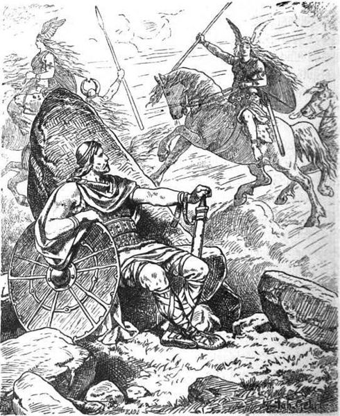 Norse mythology, a valkyrie (from Old Norse valkyrja “chooser of the slain”) is one of a host of female figures who decide which soldiers die in battle and which live. Selecting among half of those who die in battle (the other half go to the goddess Freyja’s afterlife field Fólkvangr), the valkyries bring their chosen to the afterlife hall of the slain, Valhalla, ruled over by the god Odin. There, the deceased warriors become einherjar. When the einherjar are not preparing for the events of Ragnarök, the valkyries bear them mead. Valkyries also appear as lovers of heroes and other mortals, where they are sometimes described as the daughters of royalty, sometimes accompanied by ravens, and sometimes connected to swans or horses.